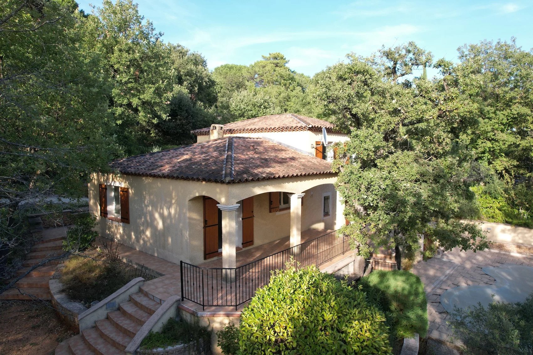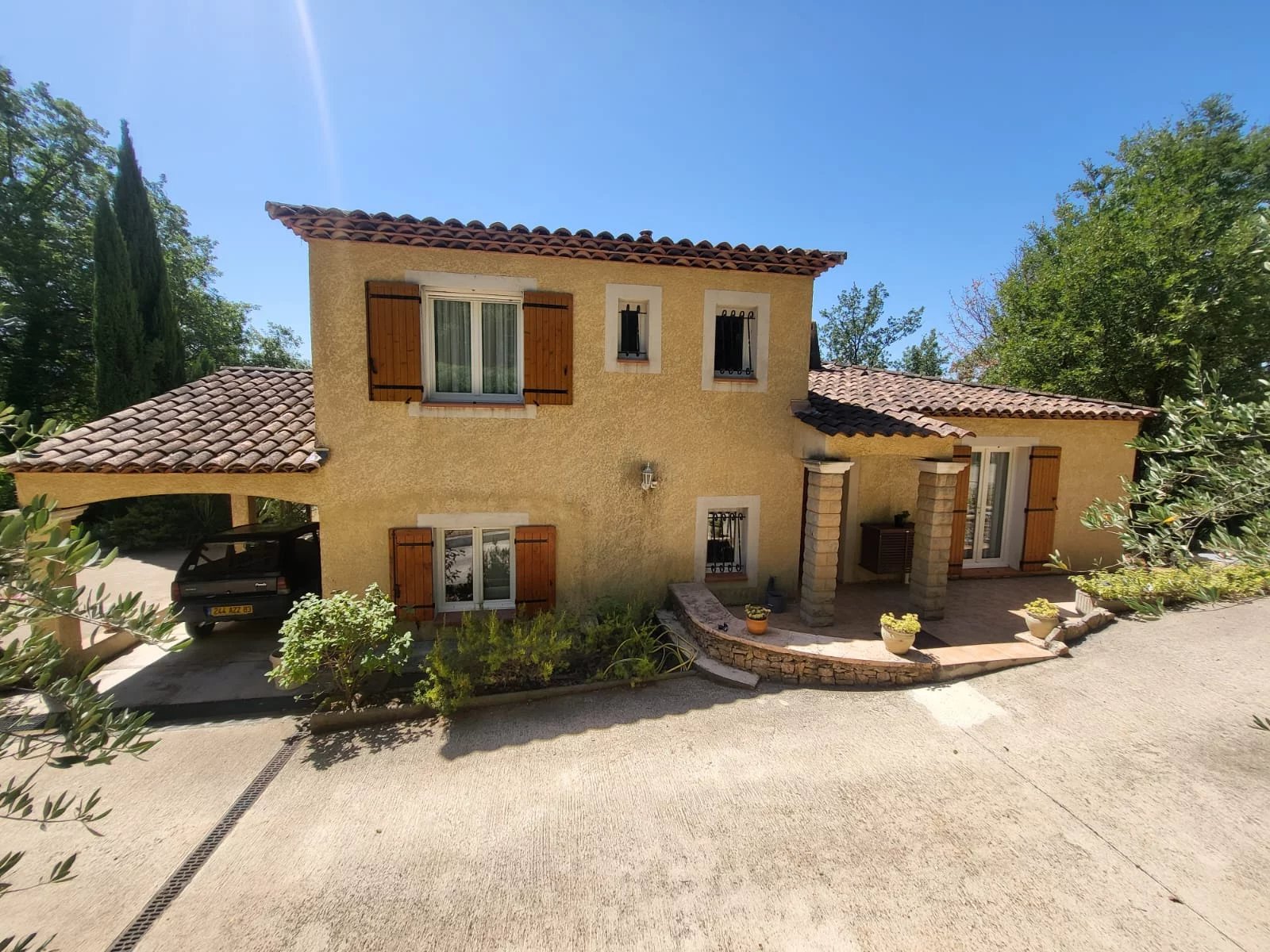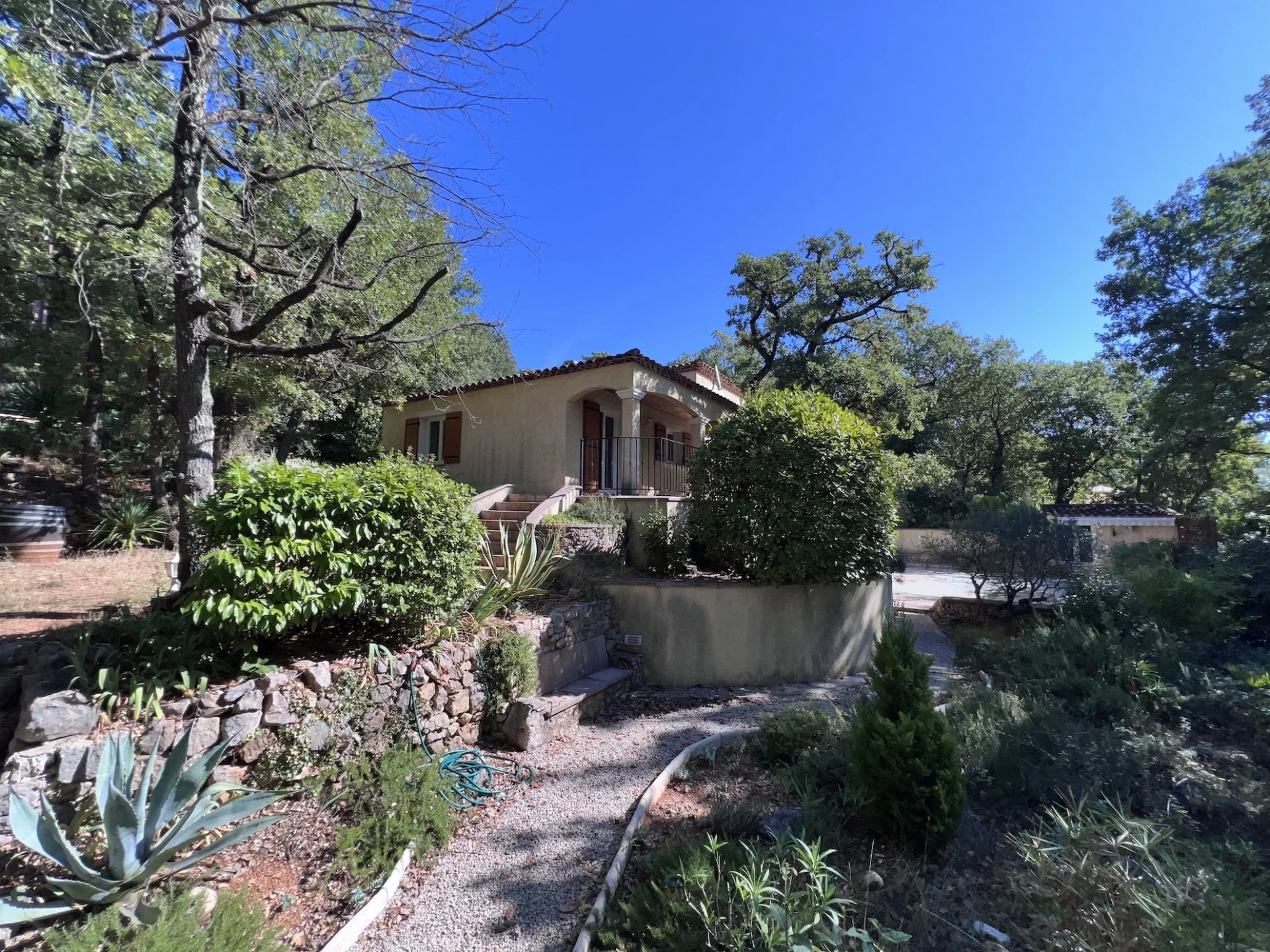 HOUSE - 5 MINUTES FROM BRIGNOLES, 45 minutes from the seaside, Toulon, Hyères and the Gorges du Verdon, in the heart of Green Provence, close to all amenities, primary schools, college... located in a quiet residential area, pleasant Provençal house set on fenced wooded plot 1 400 sqm planted with Mediterranean trees. Nice pool with its terraces, pool house. Entrance, comfortable living / dining room with chimney, large terrace on the south partly shaded, open furnished kitchen, storage room / laundry room, 2 bedrooms, shower room and toilet. Upstairs : 3 bedrooms, bathroom with toilet. Carport for 2 cars, garden shed, air conditioning, fiber, city water, mains drainage... In good condition, perfect exposition on the south, the house is light and pleasant to live in. Excellent rental income possible for seasonal rental. Quiet, privacy, it will be a peaceful place for holidays or in permanent residence. Information on the risks to which this property is exposed is available on the Géorisks website: georisks.gouv.fr